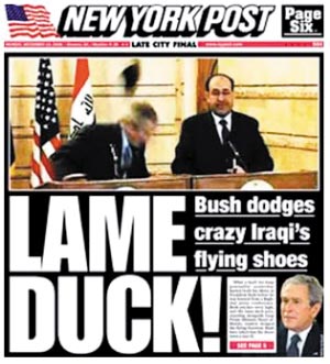 Throwing shoes at somebody is a supreme insult in the Middle East. One of the shoes sailed over the president's head and slammed into the wall behind him and he had to duck to miss the other one. Maliki tried to block the second shoe with his arm.