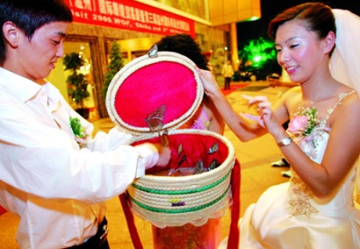 "It requires a highly precise time arrangement," said Wang Yong of the Tiantian Wedding Ceremony Company in Tianjin city southeast of Beijing, "Or else, the butterflies would either still be a chrysalis or they would be dead."