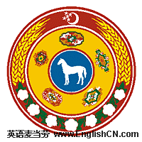 国徽:呈圆形,由三个同心圆组成。外圆周上绘有七颗带绿叶的白色棉桃、两束金色的麦穗、一弯白色新月和五颗白色五角星;中间圆周上绘有五种地毯图案;内圆面上是土库曼人为之自豪的阿哈尔捷金马。
