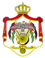 国徽: 为斗篷式。斗篷顶端有一王冠,象征约旦是一个君主立宪国。斗篷内一只展翅的萨拉丁雄鹰站在一圆球上,象征伊斯兰教义传遍全球。鹰两侧为约旦国旗,国旗下有阿拉伯宝刀和弓箭,象征伊斯兰的胜利者。代表地球的圆球下面,是麦穗和棕榈枝,象征农业。底部的绶带上用阿拉伯文写着“约旦哈希姆王国国王祈祷真主赐给他幸福和帮助”。绶带下面是一枚复活勋章。