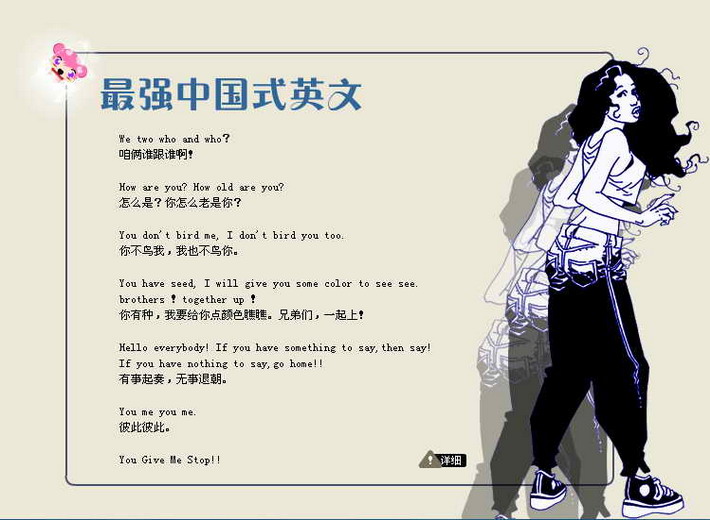 These examples are what we call Chinglish, which is a combination of English vocabulary and Chinese grammar or expresssion. When it comes to Chinglish, if all you know is "good good study, day day up," you will be considered "out man."
