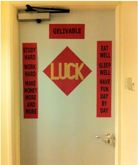 这副春联上下联各有9个英文单词、4个词组,按中国春联的格式竖排。门右侧的上联是“Eat Well Sleep Well Have Fun Day by Day”(意思是“吃得不错、睡得不错、天天都开心”),门左侧的下联是“Study Hard Work Hard Make Money More and More”(意思是“努力学习、努力工作、钱越挣越多”)。门上方的横批则是去年由中国网民创造的新英文单词“Gelivable”(意思是“给力”)。门中间还贴着一张菱形的大红纸,上面印着金色大字“LUCK”(意思是“好运”)。